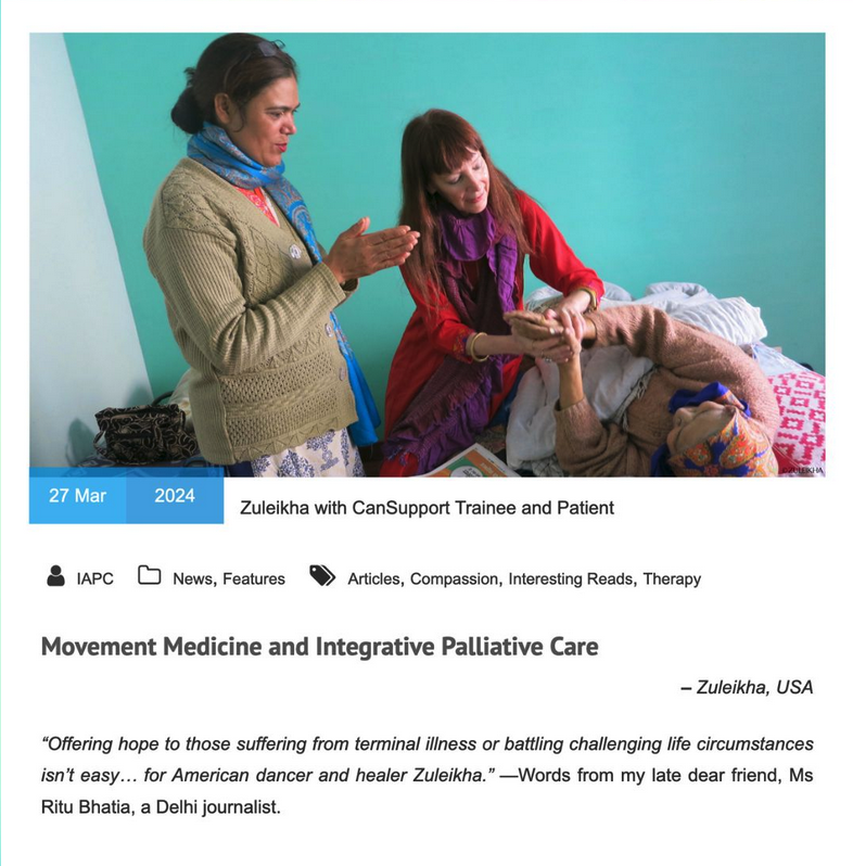In early March, 2024, the Indian Association of Palliative Care invited Zuleikha to write an article about her work with Movement Medicine and Integrative Palliative Care© in India, and her evolutionary journey for over 15 years to bring calmness, relaxation and relief to those living with long-term illness. As well, she has been training others in this method. On March 27, 2024, this article was published in the IAPC’s e-newsletter.